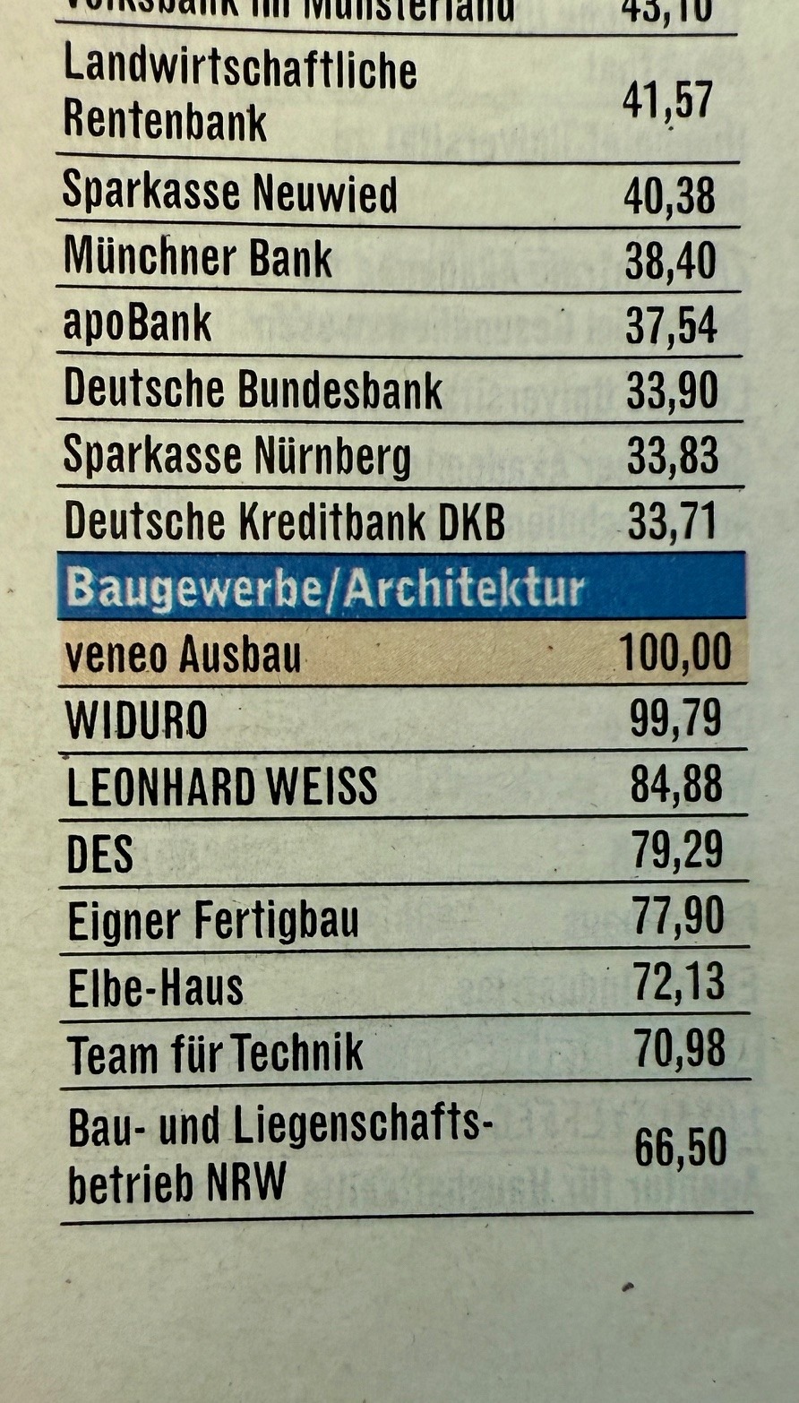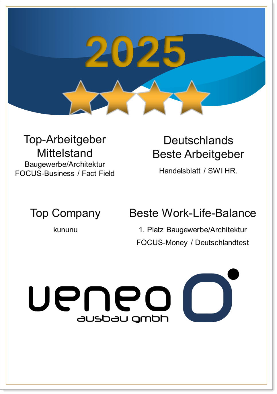 Laut FOCUS-Business zählt die #veneo Ausbau GmbH zu TOP-Arbeitgeber im Mittelstand 2022 und 2025 im Bereich Baugewerbe/Architektur. Darüber hinaus bewertet die Arbeitgeber-Bewertungsplattform kununu die #veneo